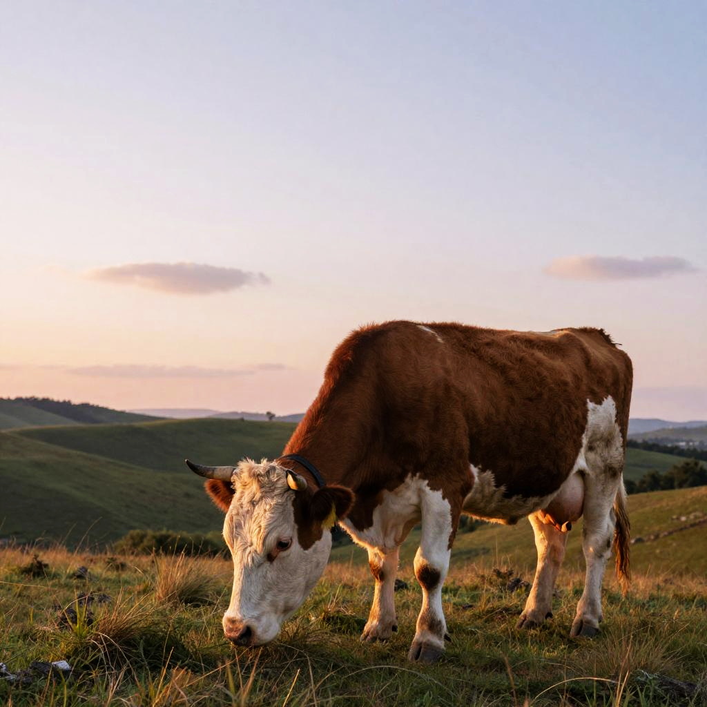 Photograph of a brown and white cow grazing on a grassy hillside at sunset, with rolling hills and a colorful sky in the background.