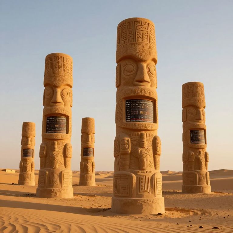 Monumental sandstone totems rise from the golden sands of a desert landscape, their surfaces intricately carved with digital clock faces and geometric patterns, evoking a surreal blend of ancient craftsmanship and futuristic technology under the warm glow of golden hour lighting.