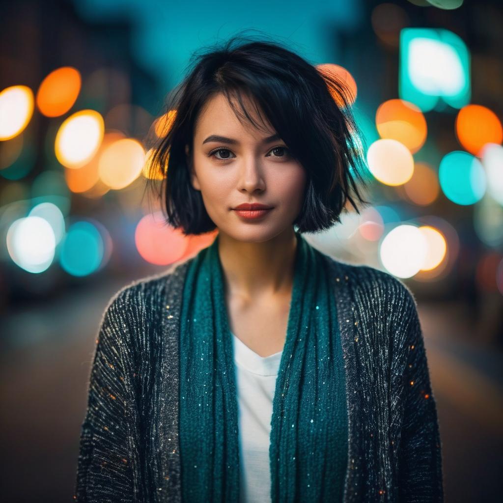 Portrait of a young woman with short black hair standing on a city street at night, wearing a loose textured cardigan and white shirt, surrounded by blurred city lights and vibrant bokeh, soft focus, cinematic lighting, moody ambiance with teal and orange color contrast, urban nighttime atmosphere, photorealistic style