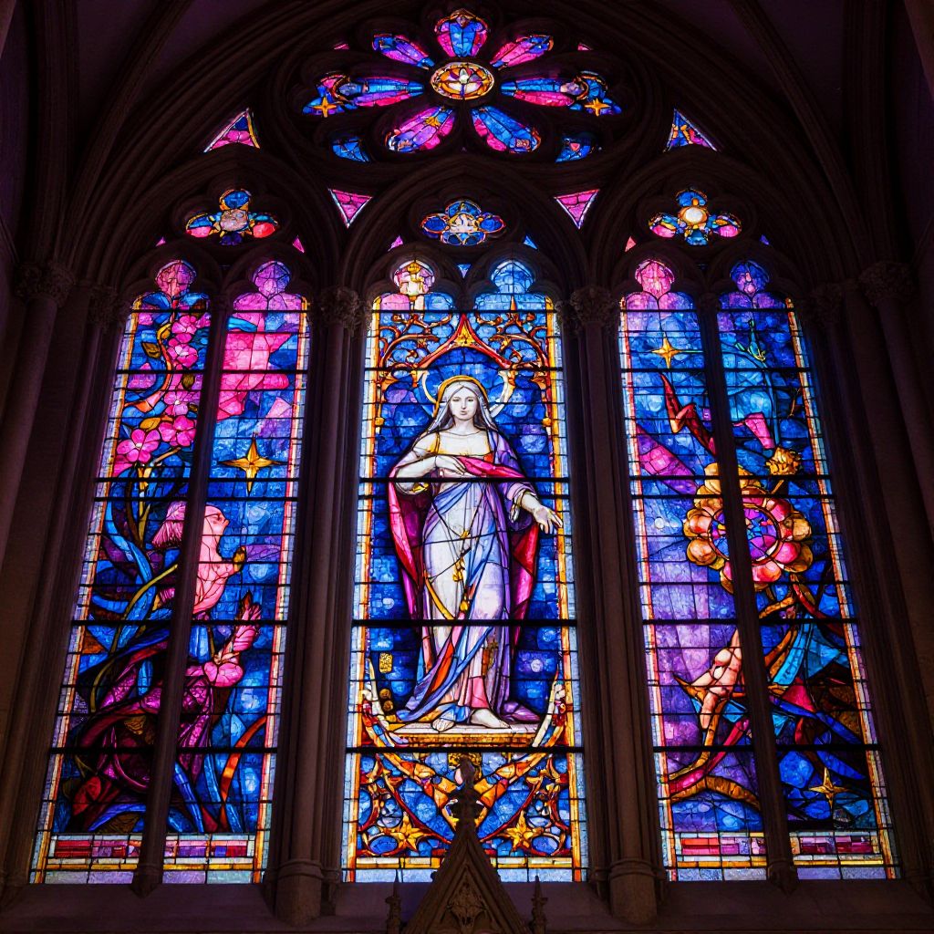 The image showcases a vast, intricately detailed stained glass window in a vaporwave cathedral, exuding an ethereal and otherworldly atmosphere. The window is composed of numerous colorful panels, each meticulously crafted with vibrant hues of pink, blue, and purple, creating a mesmerizing kaleidoscope of light. The central figure, a statue of a woman, stands majestically in the middle of the window, her form illuminated by the radiant colors surrounding her. The architectural elements, including the pointed arches and ornate tracery, add to the gothic aesthetic, while the overall composition is balanced and harmonious, with the statue serving as the focal point. The interplay of light and color within the window creates a sense of depth and dimension, making the scene appear both expansive and intimate. The 8k resolution enhances the level of detail, allowing for a closer examination of the textures and patterns within the glass and the statue.