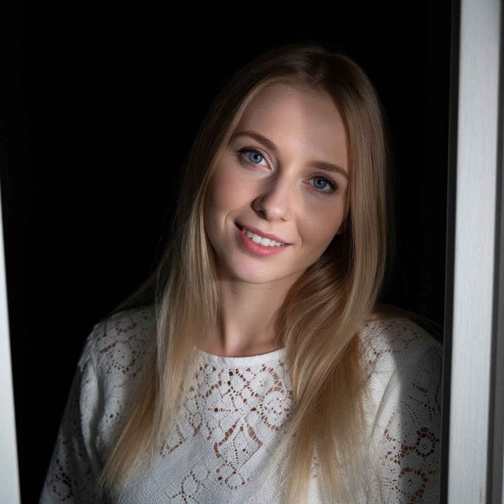 A mirrorless camera captures a Slavic woman's portrait with long blonde hair and piercing blue eyes. Her captivating smile shines against a stark black backdrop, illuminated by soft moonlight through an open window. The light casts delicate shadows across her face and the intricate lace of her white blouse. From an unconventional overhead angle, this ethereal beauty exudes introspection, highlighting the interplay between light and texture that reveals the depth hidden within her enigmatic gaze.