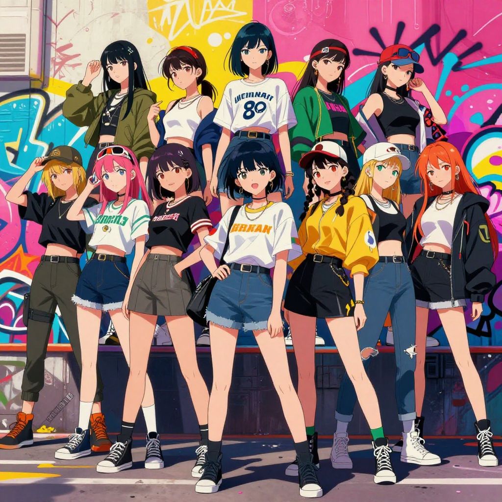 Digital anime-style illustration of a diverse group of 11 teenage girls in urban streetwear, posing confidently in front of vibrant graffiti.