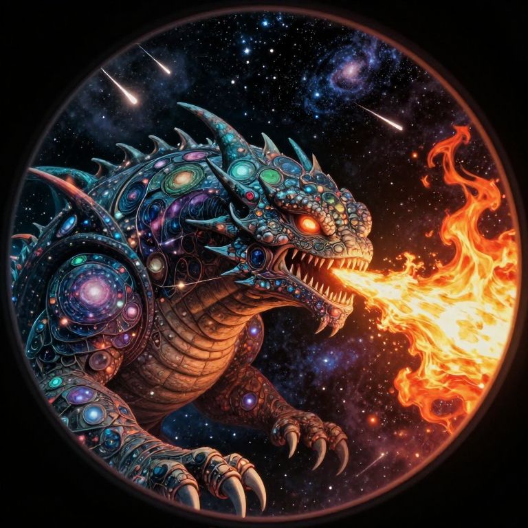 An image should be generated in the vintage comic book cover style, portraying an extraordinary scene from outer space where a colossal creature made of galaxies and stars exhales fire composed of shooting meteors. The unusual perspective is reminiscent of viewing through a telescope lens on a cosmic scale, revealing intricate details of the celestial beast's scales, which are intricately crafted from swirling nebulae and constellations. This dramatic composition evokes a sense of awe and wonder, capturing the emotional gradient between fear and admiration for this extraordinary interstellar creature that defies our understanding of both mythical beasts and cosmic wonders.