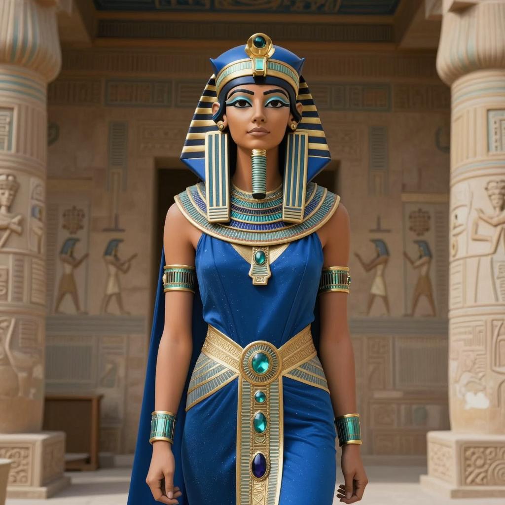 Egyptian costume homemade, photorealistic, ancient Egyptian woman, standing in front of pyramids, wearing white sleeveless dress with blue and gold trim, long green and gold draped shawl, gold and turquoise jewelry, black hair, headpiece, sand-colored stone background, detailed hieroglyphs on walls, full body shot, realistic lighting, symmetrical composition, regal and majestic, traditional Egyptian attire, detailed ures, warm color palette, historical reenactment, classic Egyptian architecture