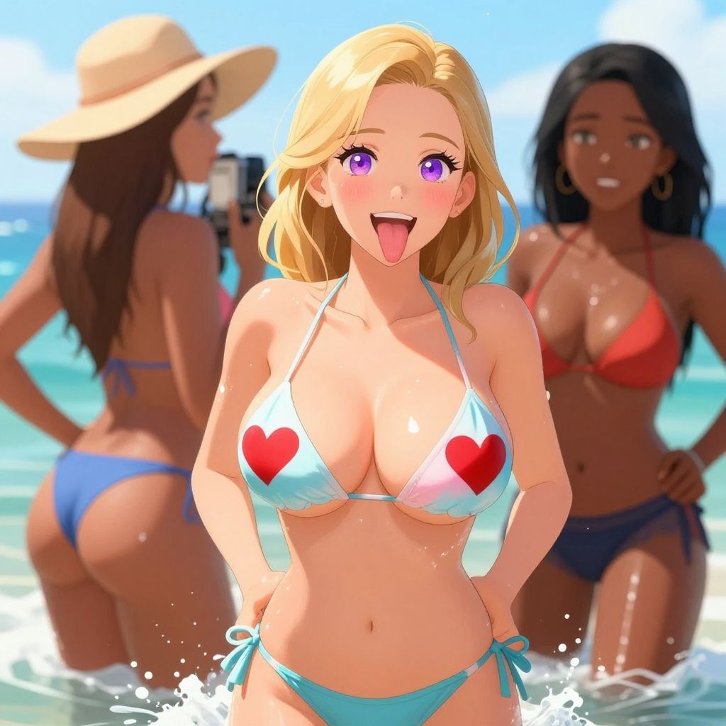 Photorealistic CGI of three beachgoers: blonde woman with heart-patterned bikini, sticking out tongue; black-haired woman in black bikini; shirt