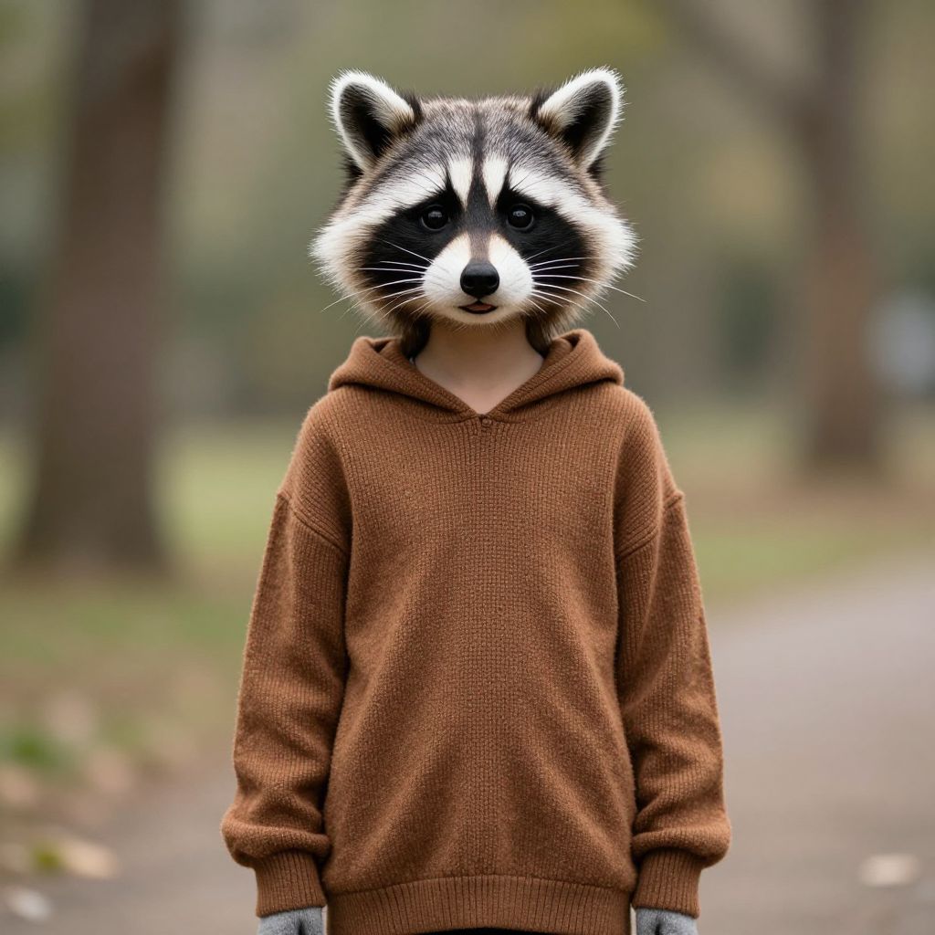Raccoon Girl Costume, in a brown sweater and a hoodie standing in a park