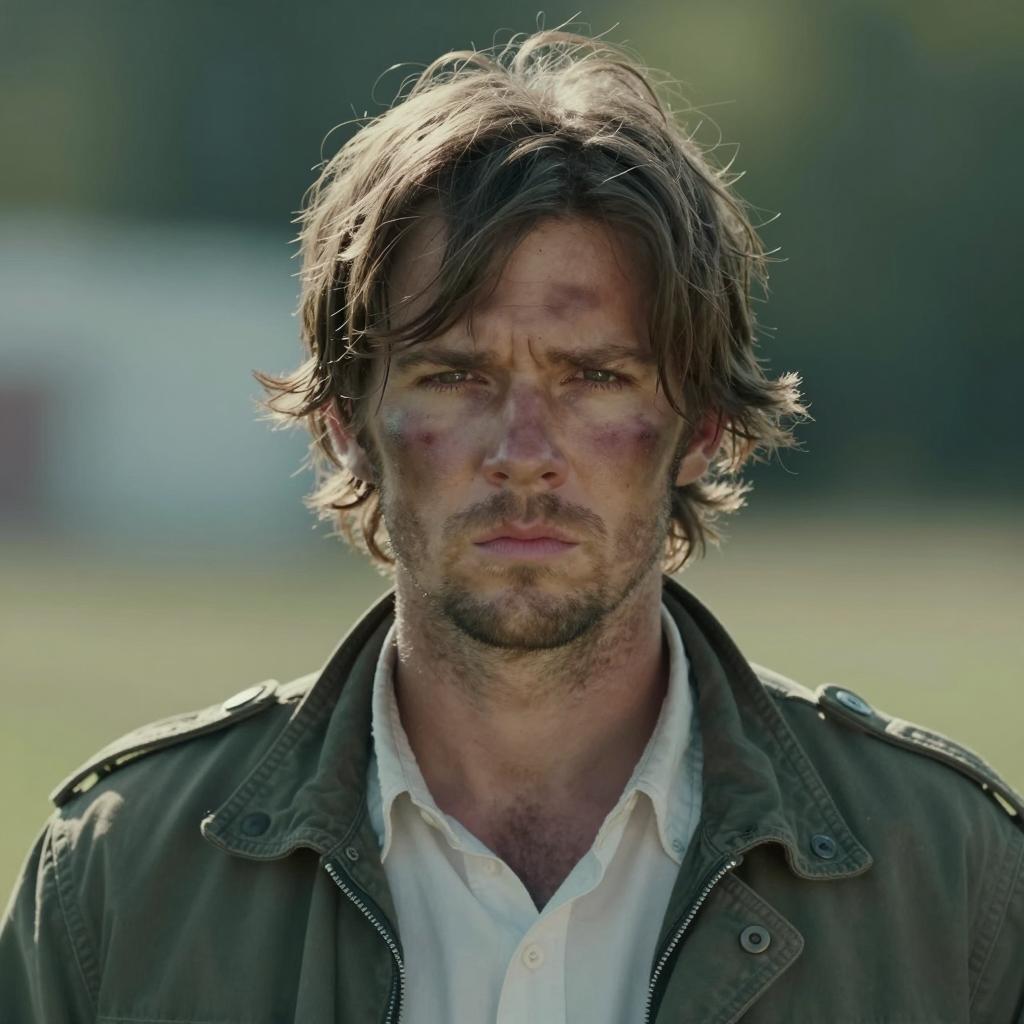 Portrait of a light-skinned man with blue eyes and short, slicked-back brown hair wearing a red prison shirt over a white t-shirt. The man has a serious and slightly concerned facial expression, set against a dark, blurred background with a window.