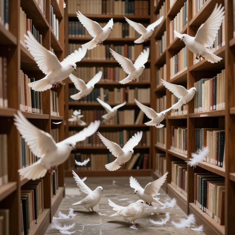 Books line the wooden shelves of a serene library, as dozens of white doves take flight, scattering fluffy feathers across the stone floor and creating a tranquil, otherworldly scene where knowledge and nature intertwine.