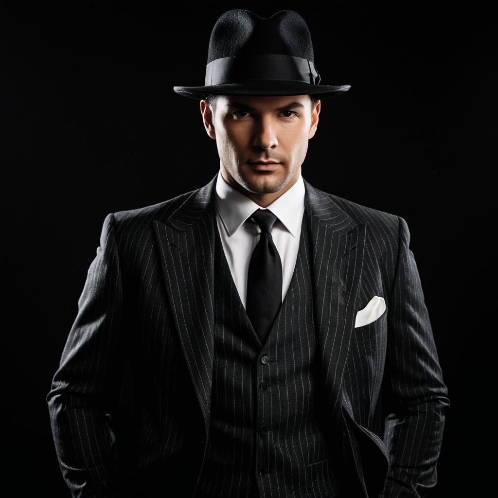 Mobster costume man fancy, photorealistic portrait, male, dark-haired, fair skin, wearing black fedora, gray pinstripe suit, white dress shirt, black tie, black vest, black pocket square, serious expression, standing, studio lighting, dark brown ured background, high contrast, classic style, slightly dramatic, well-groomed, professional attire, close-up, upper body shot, formal, vintage look, stylish, sophisticated