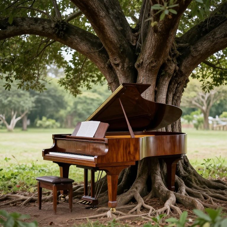A grand piano emerges seamlessly from the roots of a majestic tree, its polished surface blending with the natural contours of the trunk, creating an ethereal fusion of music and nature where the boundaries between the organic and the man-made dissolve into harmony.