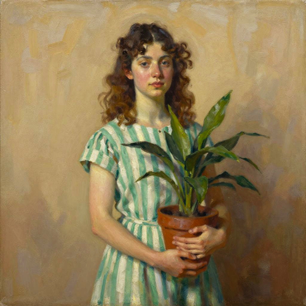 A realistic portrait of a young woman with curly hair holding a potted green plant, wearing a green and white striped dress, standing against a warm beige wall, natural sunlight casting soft shadows, painterly brushwork, classic oil painting style, earthy tones color with warm beige and green colors