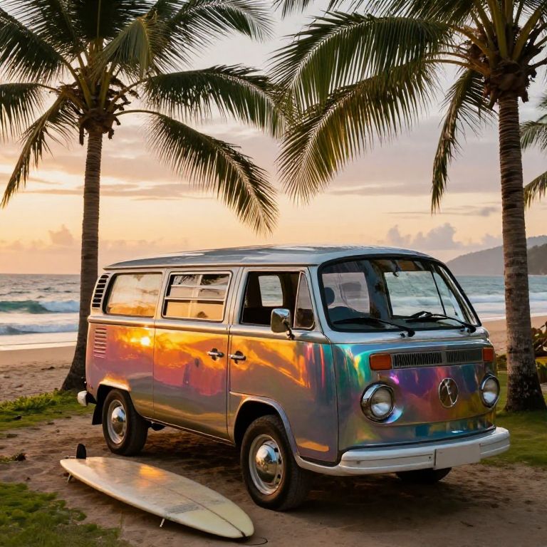 Kombi van parked in a lush tropical beach setting during sunset, vibrant colors reflecting on shiny vintage metal, surrounded by palm trees and surfboards resting on sand, peaceful ocean waves in the background, warm and nostalgic atmosphere.