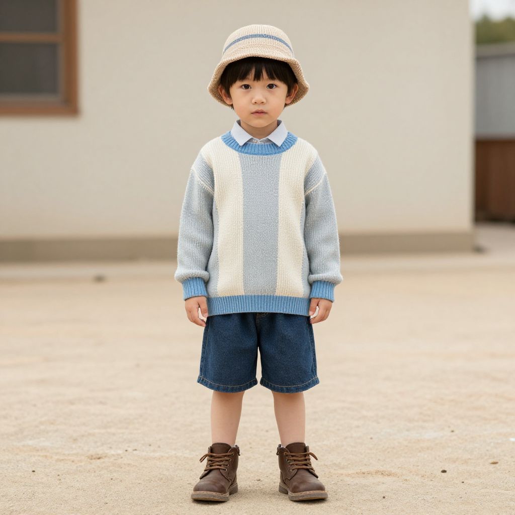 Photograph of a young Asian boy standing outdoors, wearing a light blue and white knit sweater, denim shorts, brown shoes, and a straw bucket hat