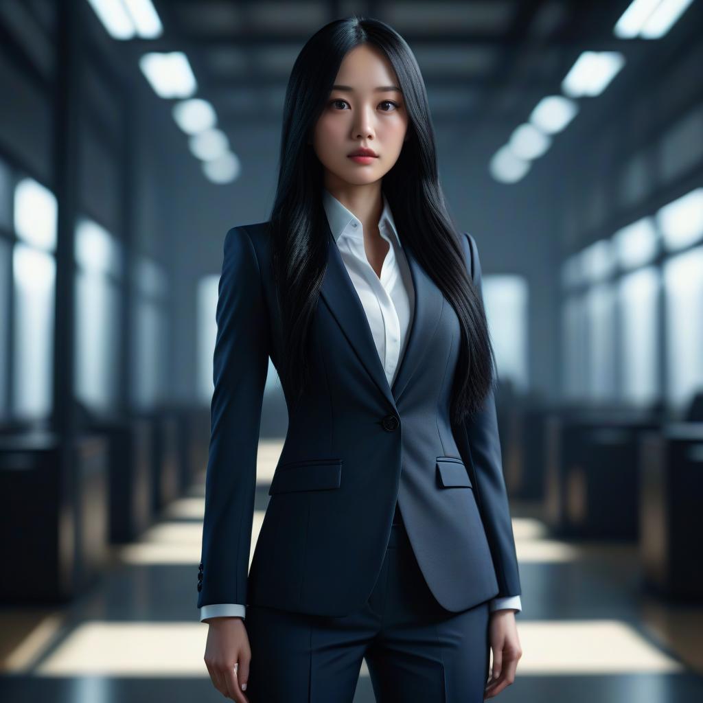A full-body photo of Jessica, a petite Asian woman with long black hair, in a tailored business suit. Stern look with piercing blue eyes, realistic detail, depth of field, hyper-detailed, 8K, cinematic lighting, super-resolution