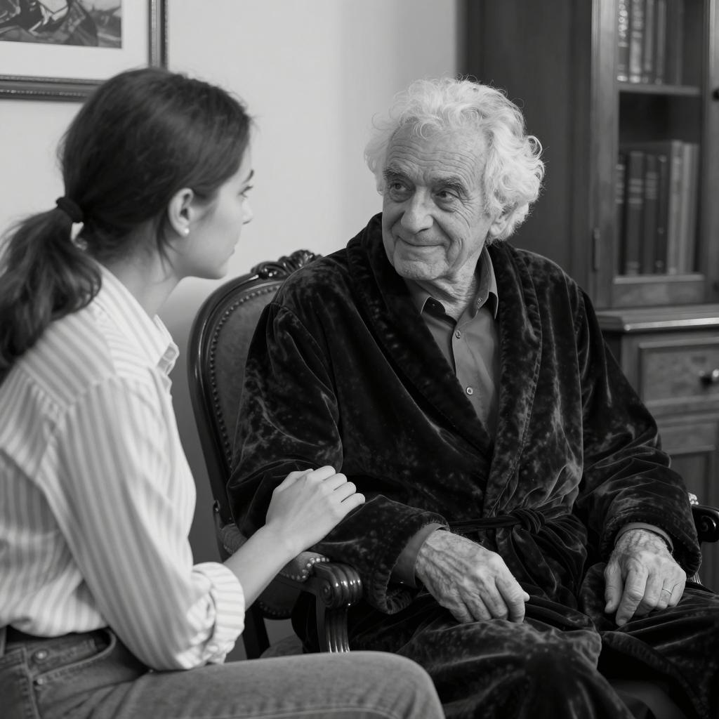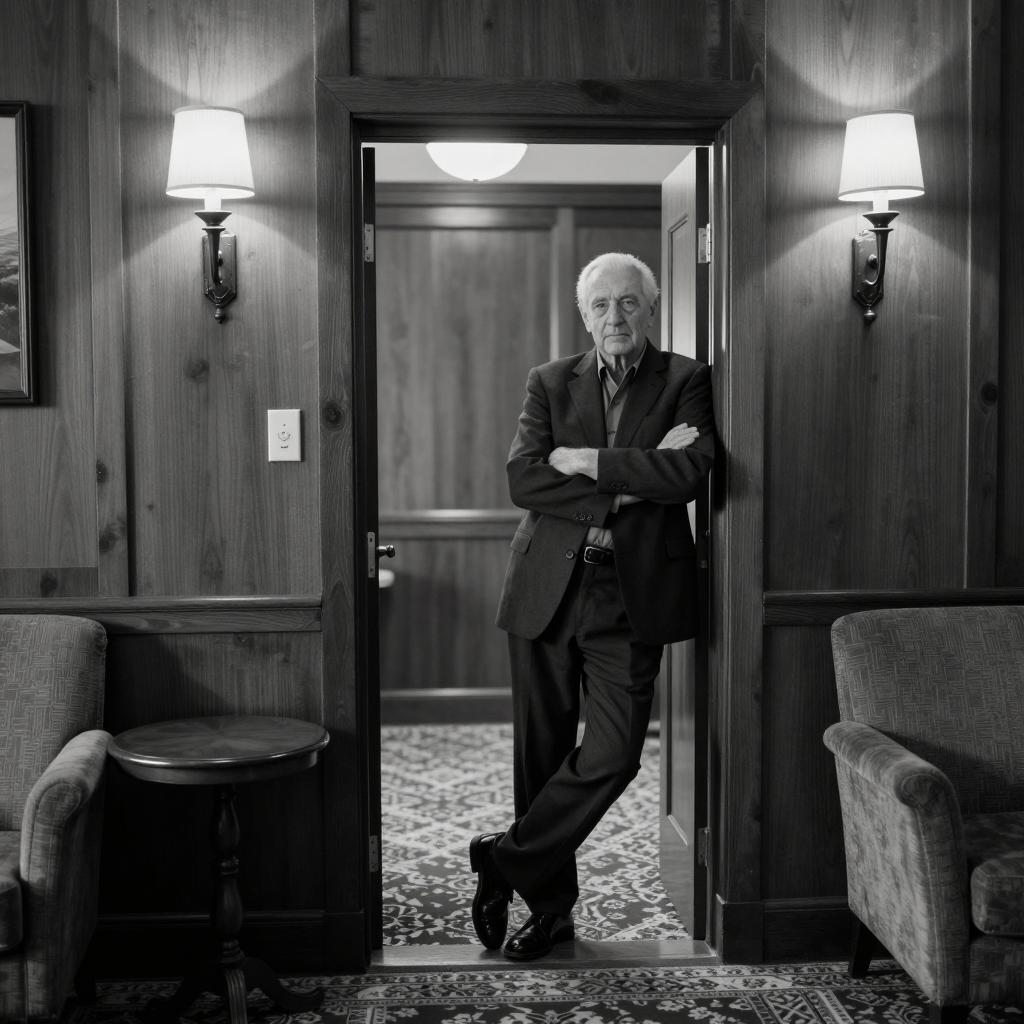 Black and white photograph. Elderly man with short hair, dark suit, standing in doorway, arms crossed, looking forward. Wooden walls, two wall sconces, patterned carpet, small round table on left, armchair on right. Man's expression is serious. Doorframe partially open. One wall switch visible on left.