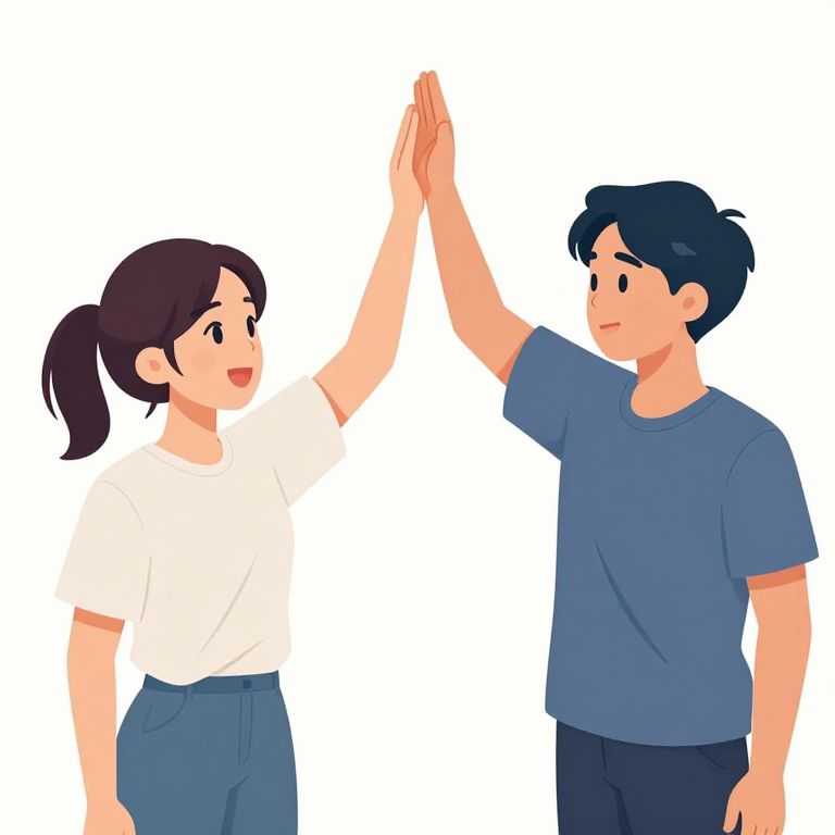 Digital illustration of a smiling couple with light skin, dark brown hair, and casual clothes, high-fiving against a white background.