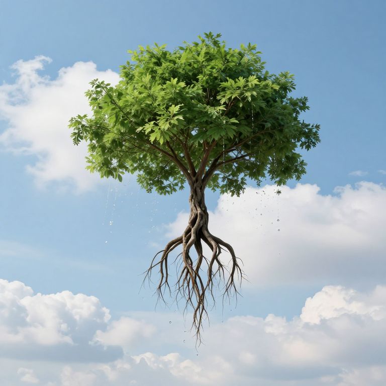 Upside-down tree suspended in mid-air, its roots extending downward through wispy clouds while vibrant green foliage and cascading droplets of water defy gravity against a backdrop of serene blue skies and fluffy white clouds.