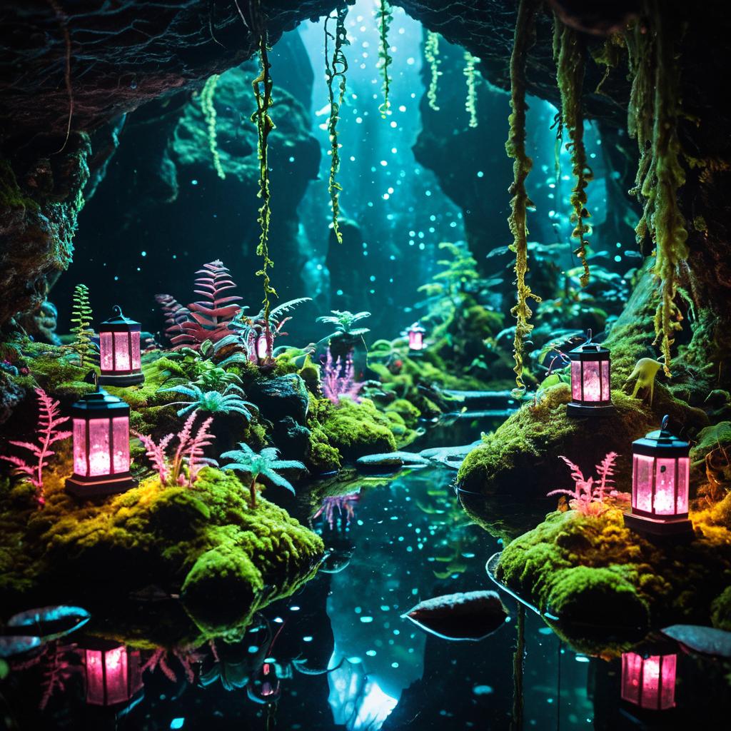 A vibrant fantasy scene inside a crystal cave featuring tiny salamanders surrounded by bioluminescent glowing moss and small ferns. Pink and teal lanterns illuminate the peaceful, reflective pond, with intricate crystals and lush moss-covered rocks enhancing the mysterious atmosphere.