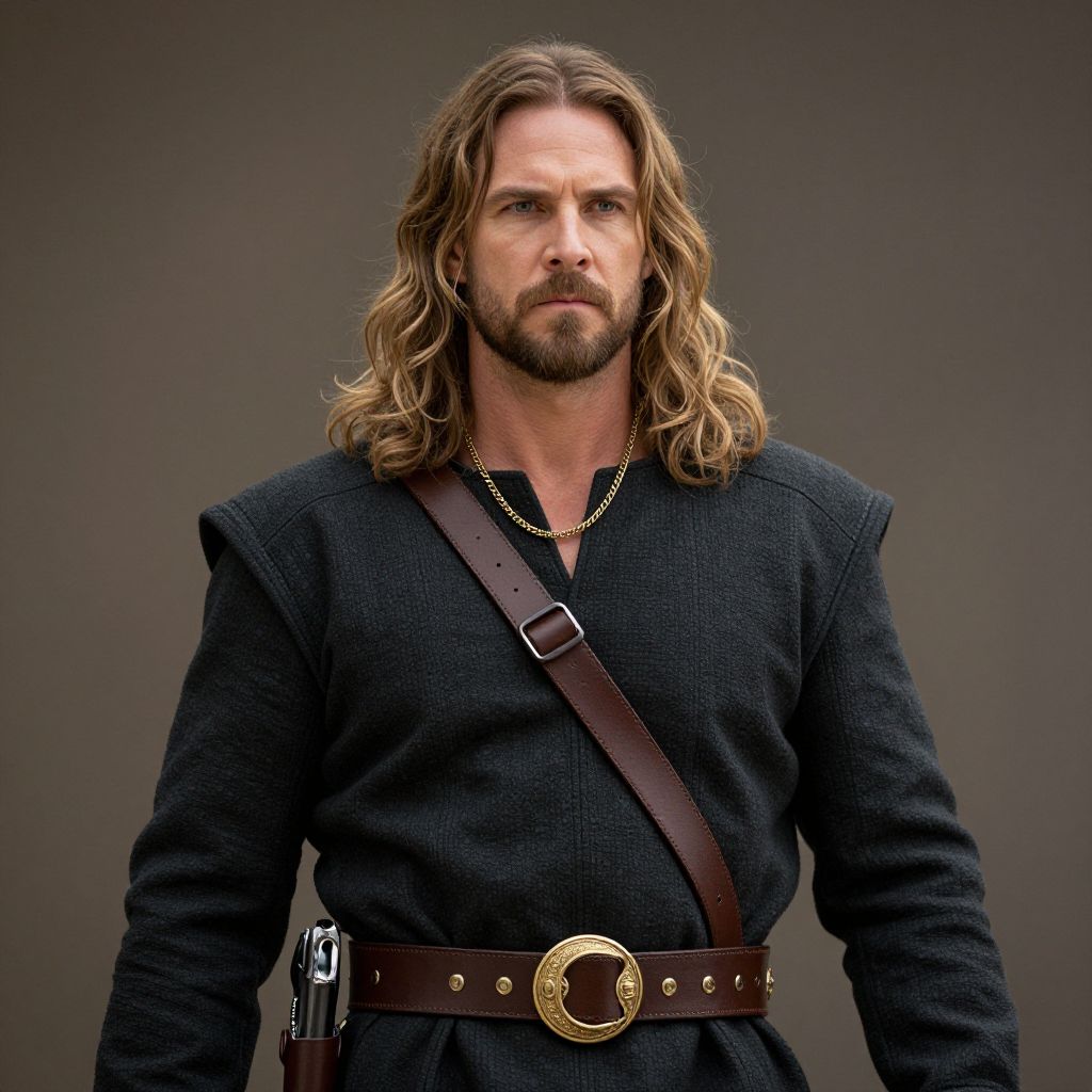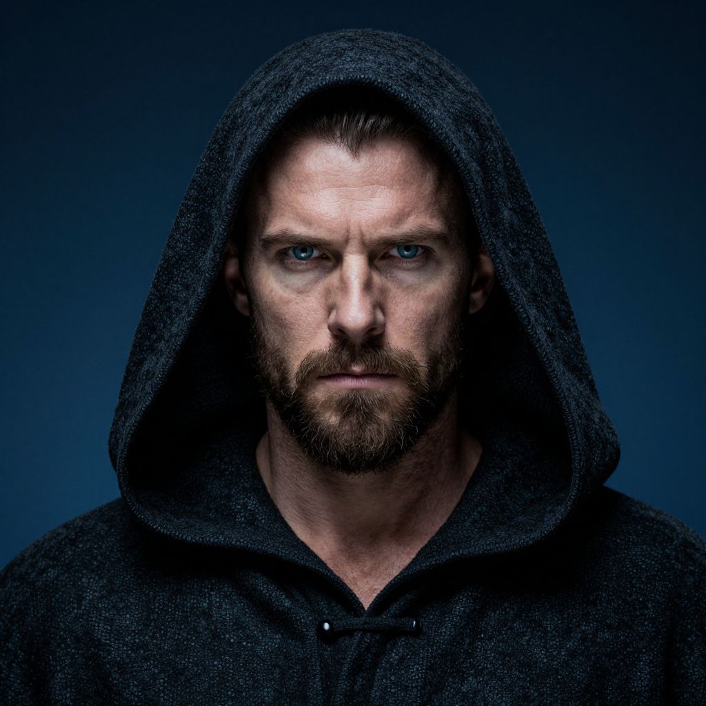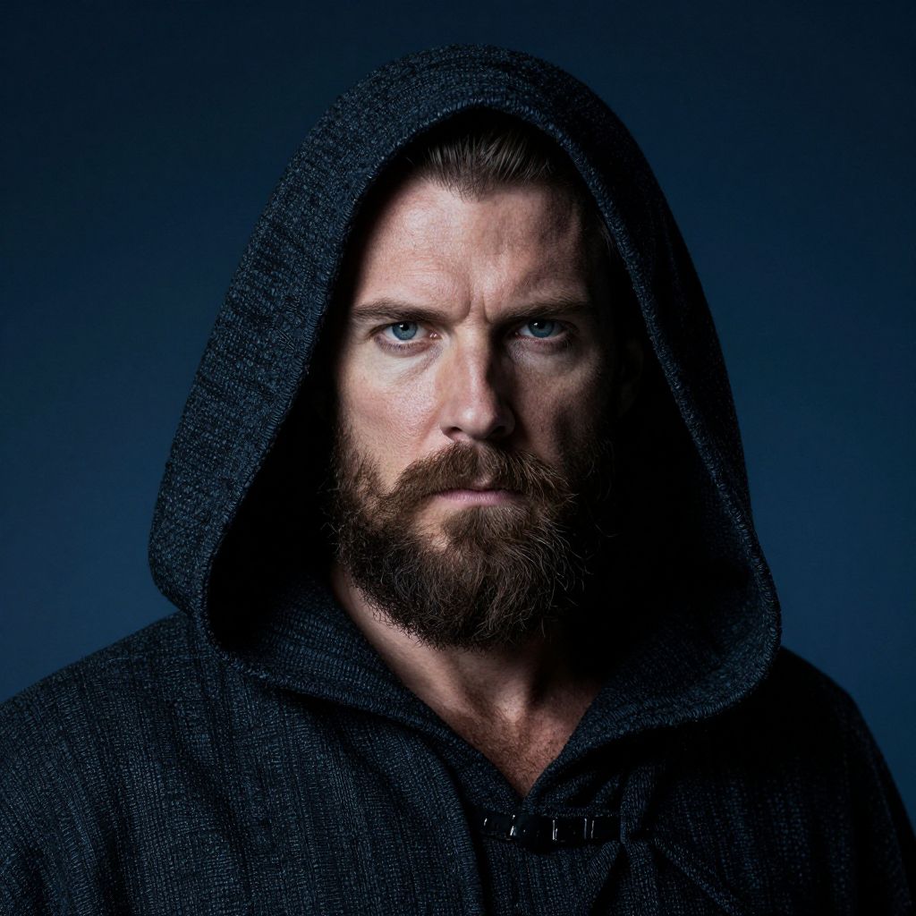 Photograph of a rugged, bearded man with piercing blue eyes, wearing a dark, textured hooded cloak that casts shadows over his face. The background is a deep, gradient dark blue, highlighting his intense gaze and serious expression. His hair is neatly combed under the hood, and the cloak's texture contrasts with the smoothness of his skin. The lighting is dramatic, focusing on his face.