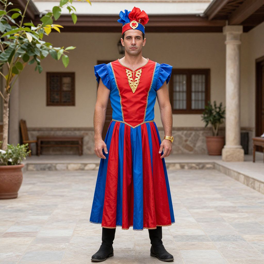 Turkish Delight Costume, man in a red and blue skirt standing in a courtyard