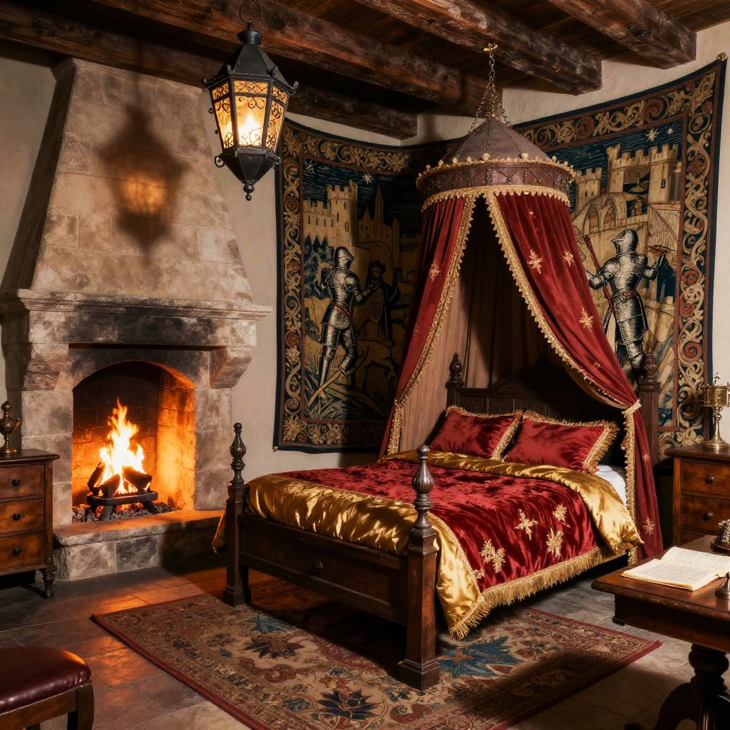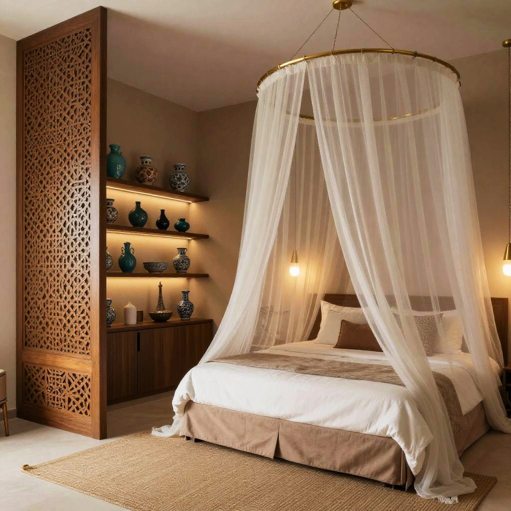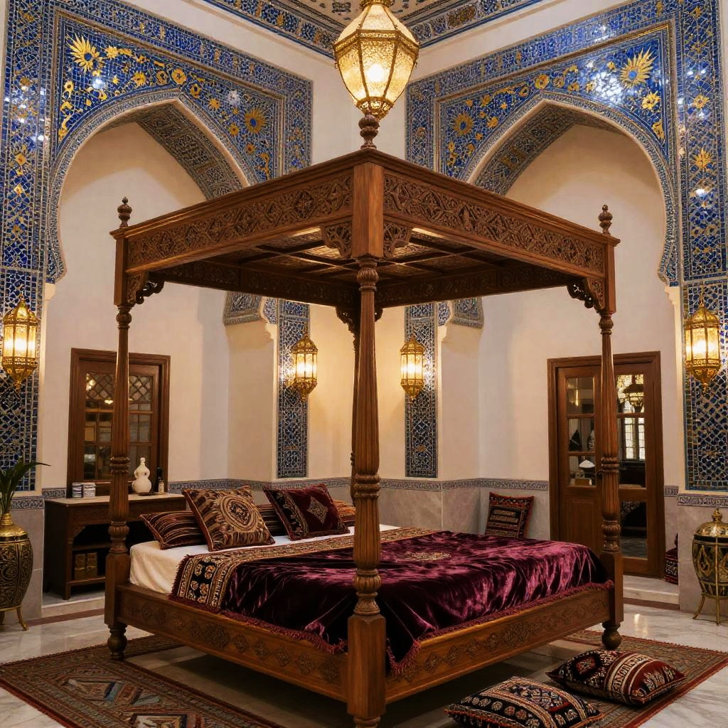 Spacious Arabic bedroom featuring lavish silk curtains, intricately carved wooden bed frame, vibrant tapestry tapestries in deep reds and blues, large floor cushions, and traditional geometric patterned rugs, illuminated by soft natural light filtering through stained glass windows.