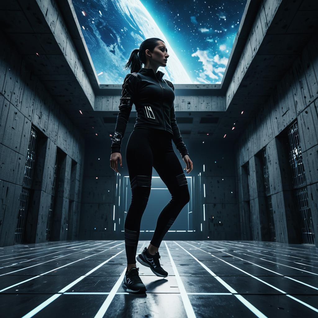 A curvy woman and a robotic hero surrounded by a synthesized hologram AI, floating in a brutalist space sky, gothic, rich deep colors, in the style of Francis Bacon, rendered in Blender, ultra-realistic, smooth shadows, ultra detail, high resolution, cinematic, Unreal Engine 6, 8k 3D