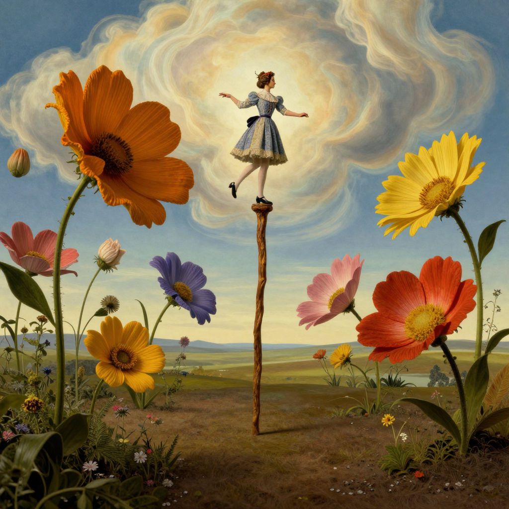 Craft an image embodying surrealistic elements, reminiscent of Dalí's dreamlike visions, depicting a whimsical garden from the perspective of a tiny creature. Imagine oversized, vibrant flowers defying gravity, suspended mid-air amidst swirling clouds. An elegant figure in vintage attire gracefully balances atop a colossal walking stick, navigating through this fantastical landscape. As she moves, the flowers respond to her presence, shifting colors and shapes, creating an air of enchantment and mystery that challenges our perception of reality.