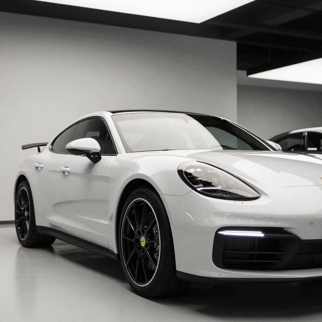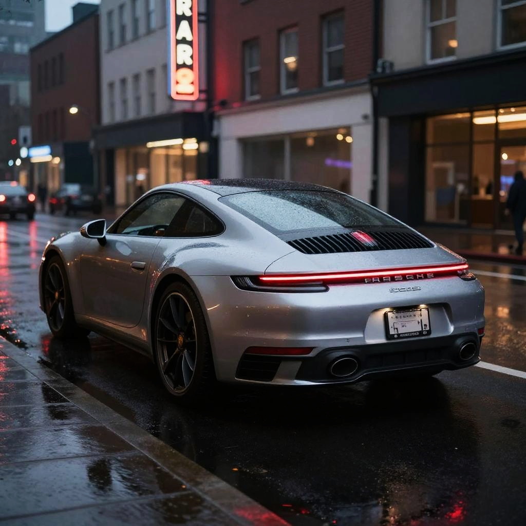 Photograph of a sleek, black sports car with a large rear spoiler, parked on a wet, reflective street. The car has glossy black paint, black alloy wheels with yellow brake calipers, and red taillights. It is positioned at a slight angle, showing the side and rear. The background features a red-brick building with two large, gray garage doors and a green metal gate. Overhead lights are visible, and the street is wet, reflecting the car's image. The overall scene has a rainy, urban atmosphere with a focus on the modern, high-performance vehicle.