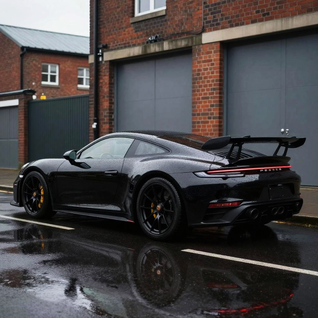 Photograph of a sleek, black, high-performance sports car with a large rear spoiler, parked on a wet, reflective street beside red brick garages