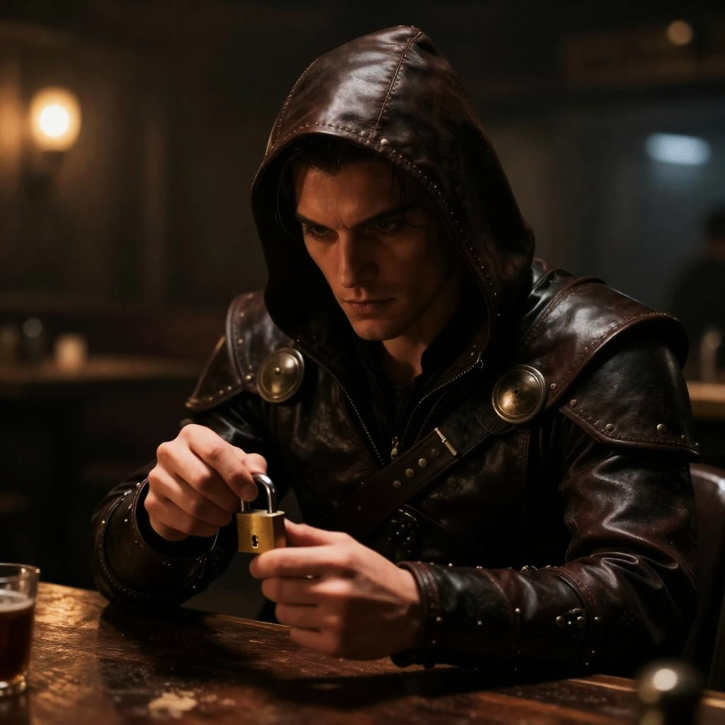 Realistic photo.a cunning human rogue, dressed in dark leather armor, stealthily picking a lock, in a dimly lit tavern, with a feeling of secrecy and intrigue. realistic photo