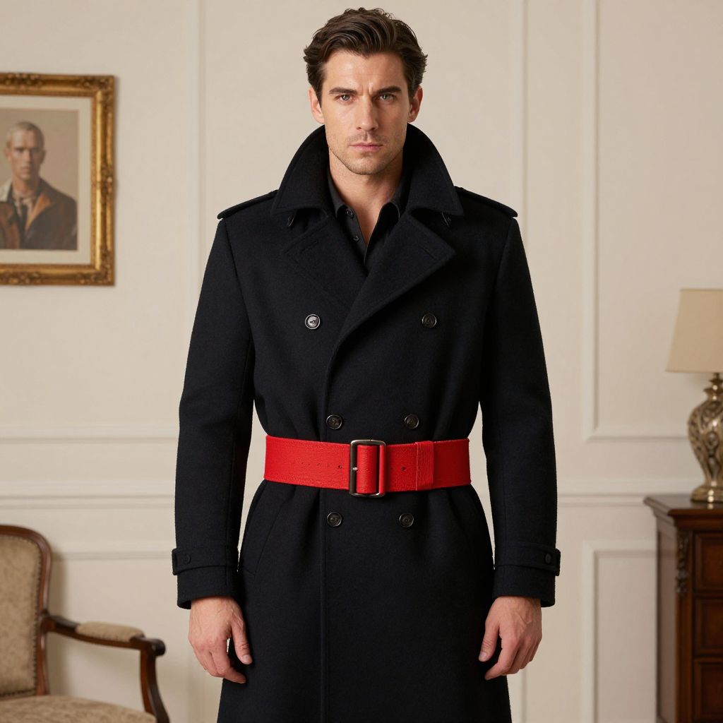 Photograph of a handsome, white male with short, dark brown hair, wearing a black, double-breasted overcoat with red belt, standing in a well-lit, elegant room. His expression is serious, and he gazes directly at the camera. The background features a white wall with a framed portrait of a man on the left and a wooden side table with a beige lamp on the right. The overcoat's texture appears smooth and slightly glossy, contrasting with the bright red belt. The room has classic, vintage furniture, contributing to a sophisticated atmosphere.