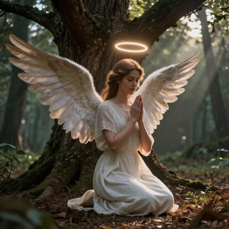 Halo images angel kneeling in quiet prayer beneath an ancient tree, halo glowing softly overhead, intricate detailed feathers catching the ambient light, mystical forest background with soft sunbeams filtering through, spiritual and contemplative scene.