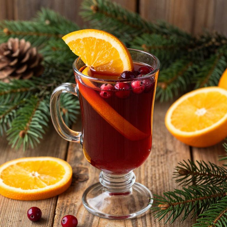 Warm mulled wine served in a transparent glass mug, garnished with orange slices and cranberries, rests on a rustic wooden surface surrounded by festive pine branches and additional fruit accents.
