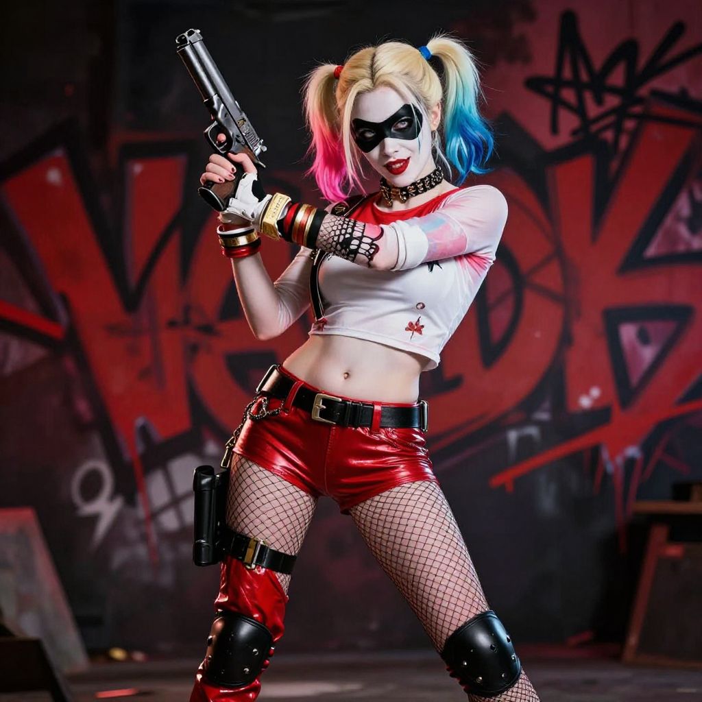 CGI image of Harley Quinn with dyed pink-and-blue pigtails, white crop top, red shorts, fishnet stockings, holding a gun