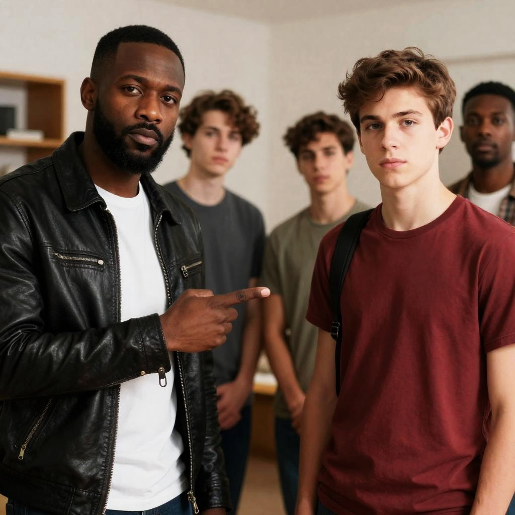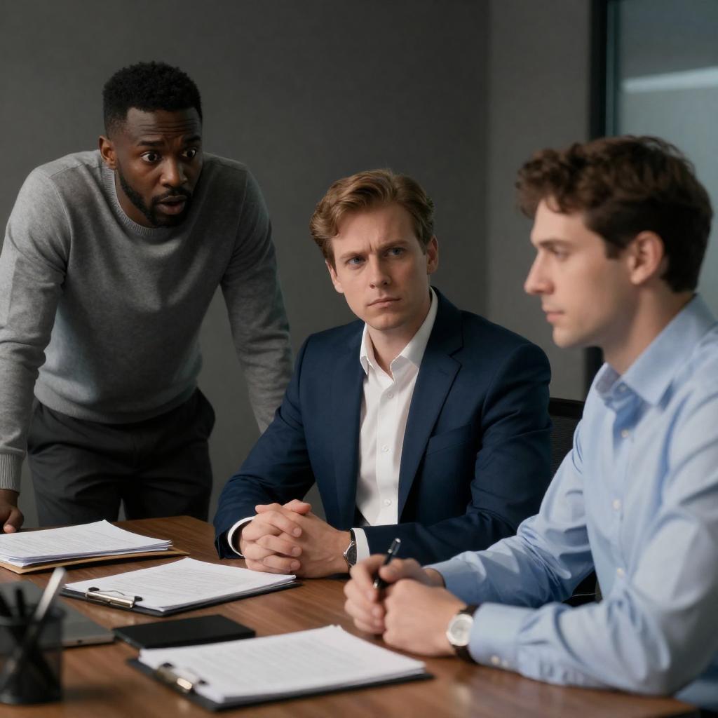 Photograph of four men standing indoors. Left man in white and red jacket, dark skin, short hair, serious expression. Center man in black and white patterned shirt, light skin, short hair, neutral expression. Right two men in dark tank tops, serious expressions. Brightly lit background with blurred lights.