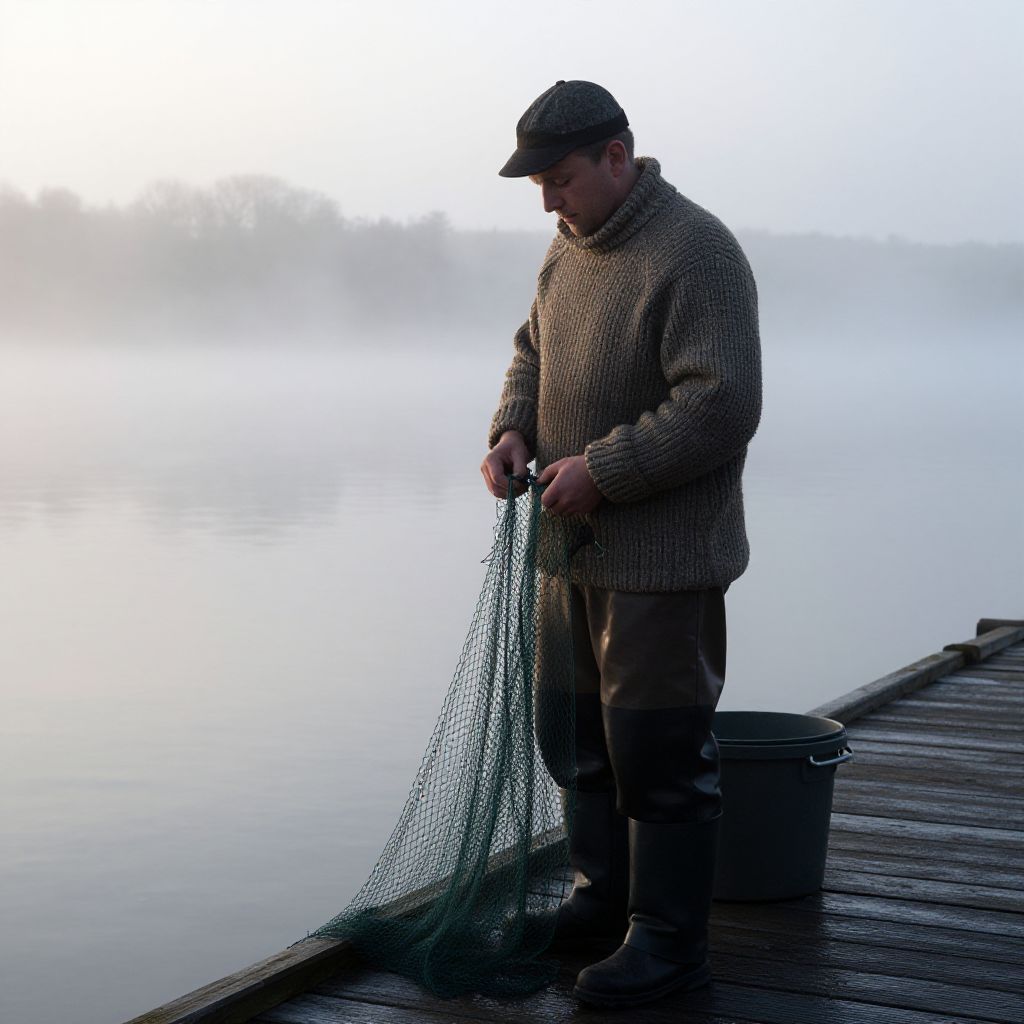 Photograph of a middle-aged Caucasian man standing on a wooden dock by a misty lake. He is wearing a brown checkered wool sweater, beige pants, brown boots, and a flat cap. He is holding a large green fishing net, looking down at it with a focused expression. A black bucket is placed on the dock to his right. The background features a calm lake with a white misty fog, creating a serene and peaceful atmosphere. The man's posture is slightly hunched, and the soft light from the overcast sky highlights the texture of his clothing and the net.