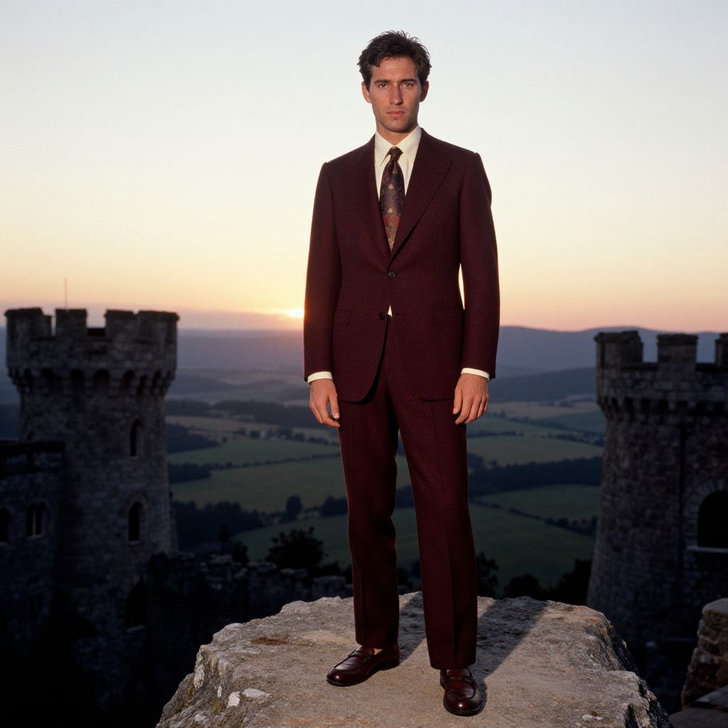 A man, deep burgundy textured wool suit, single-breasted blazer, straight-leg trousers, ivory dress shirt, patterned silk tie, brown leather loafers, crumbling castle towers, sweeping valley views, sunset glow, kodachrome analog film, confident expression. Man has masculine face and piercing eyes