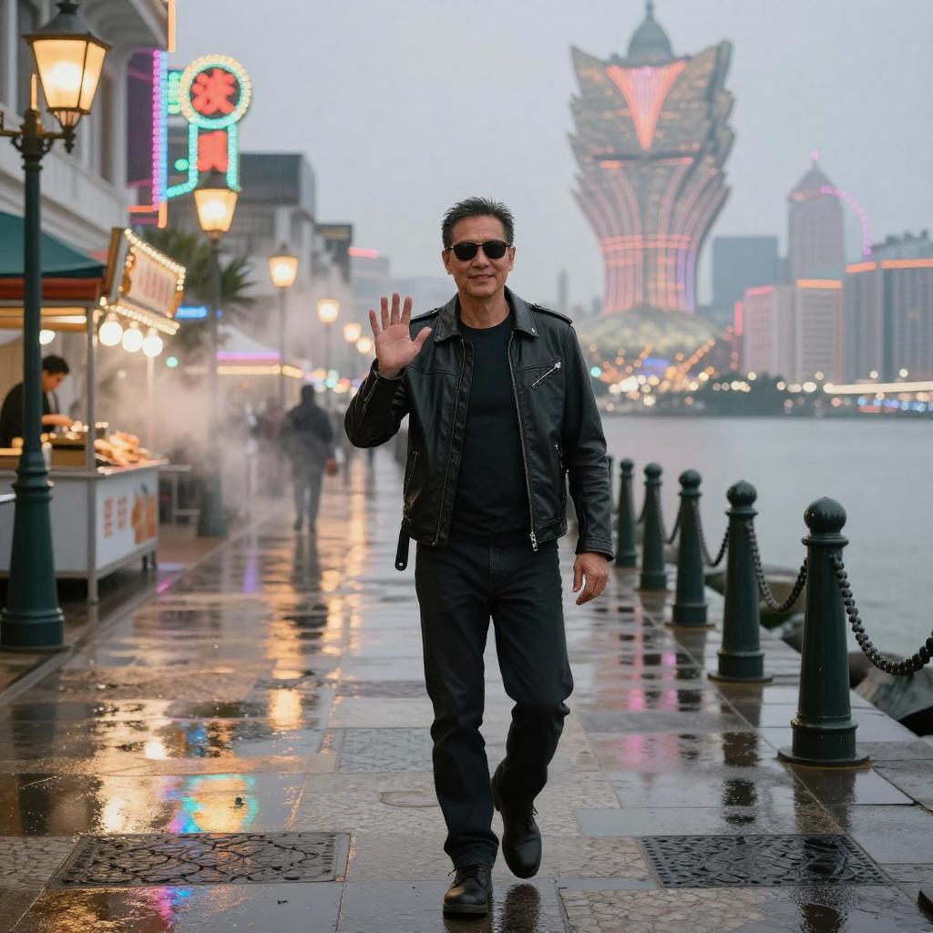 (8k, RAW photo, best quality, masterpiece:1.2), (realistic, photo-realistic:1.37), handsome middle-aged man in stylish black leather jacket and sunglasses, cute:1.2, neon-lit Macau waterfront promenade near Fisherman's Wharf and casino facades, wet cobblestone walkway, decorative lanterns and neon casino signs, distant ferris wheel lights, light drizzle with heavy seaside mist and occasional sea spray, glossy cobblestones reflecting multicolored neon, warm steam rising from nearby food kiosks, soft haze and drifting lantern smoke, professional lighting, rim light, photon mapping, radiosity, physically-based rendering, PBR, atmospheric perspective, front-facing, whole body, delicate face, soft smile, looking at viewer, five fingers, natural skin, minimal makeup, DSLR street photography, 35mm lens, shallow depth of field, film grain, high contrast, color graded, candid vibe, selfie pose