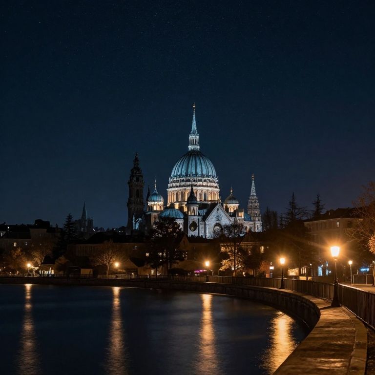 Sehenswürdigkeiten under a starry night sky, illuminated famous landmarks glowing softly against the dark sky, reflections in calm water, cozy street lamps casting warm light, serene and mysterious mood with cool blue and warm amber tones