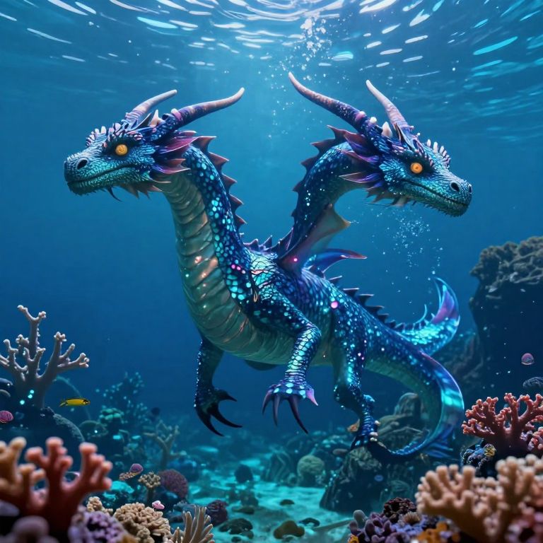 Create an alluring digital artwork featuring a dragon flying over an enchanting underwater kingdom, reminiscent of dreamlike landscapes. The resplendent creature's scales shimmer with a vibrant spectrum of colors that blend seamlessly with the luminous hues of flourishing coral gardens and darting schools of fish performing a captivating dance. This mesmerizing scene should be captured from the perspective of a bewitching mermaid as she gracefully navigates her aquatic realm, masterfully intertwining serenity and wonder into an emotional tapestry that highlights both the dragon's celestial grandeur and the ethereal beauty of this fantastical underwater world.
