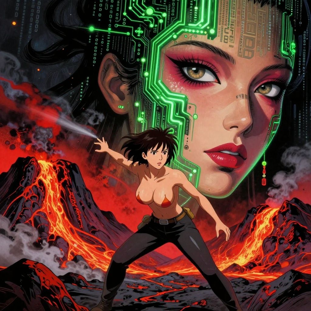 Girl, Posing as if about to throw a dart, girl (21yo:1.5) and Maldivan and (Heart-Shaped Face, Asian Eyes, [eye color grey], Nose with an Ample Base Shape, soft lip contours, lower cheekbones, soft chin) with ( eyescolor eye colors Hazel) and (breast Torpedo-shaped, pointed, elastic breasts) and random hairstyle volcanic landscape, our fearless explorer finds themselves amidst a scene of impending chaos. Molten lava cascades down the mountainside, casting an ominous red glow across the rocky terrain. With smoke and ash billowing into the sky, the adventurer races against time, by Satoshi Kon and Mike Mignola, (black, alluring, masterful:1.4), poster art, bold lines, hyper detailed, expressive, award winning, (landscape:1.4), (intricate details, masterpiece, best quality:1.4), key lighting, looking at viewer, dynamic pose, wide angle view, In a world where the digital and the organic have intertwined, a face emerges from the matrix of reality. The eyes, mouth, nose, and face are visible, but the rest of the body is obscured by the dense, swirling patterns of binary code that make up the background. The features of the face are a canvas of flesh interwoven with vibrant green circuits, pulsing with the rhythm of binary codes, MATRIX Style, dynamic, dramatic, vibrant colors, graffiti art style, heavy slut makeup, heavy slut blusher, heavy slut eye shadow, heavy slut eyeliner, heavy slut mascara, heavy slutlip liner, red lipstick, ((ultra realistic, extremely fine details, natural skin texture)), extremely detailed eyes lips nose