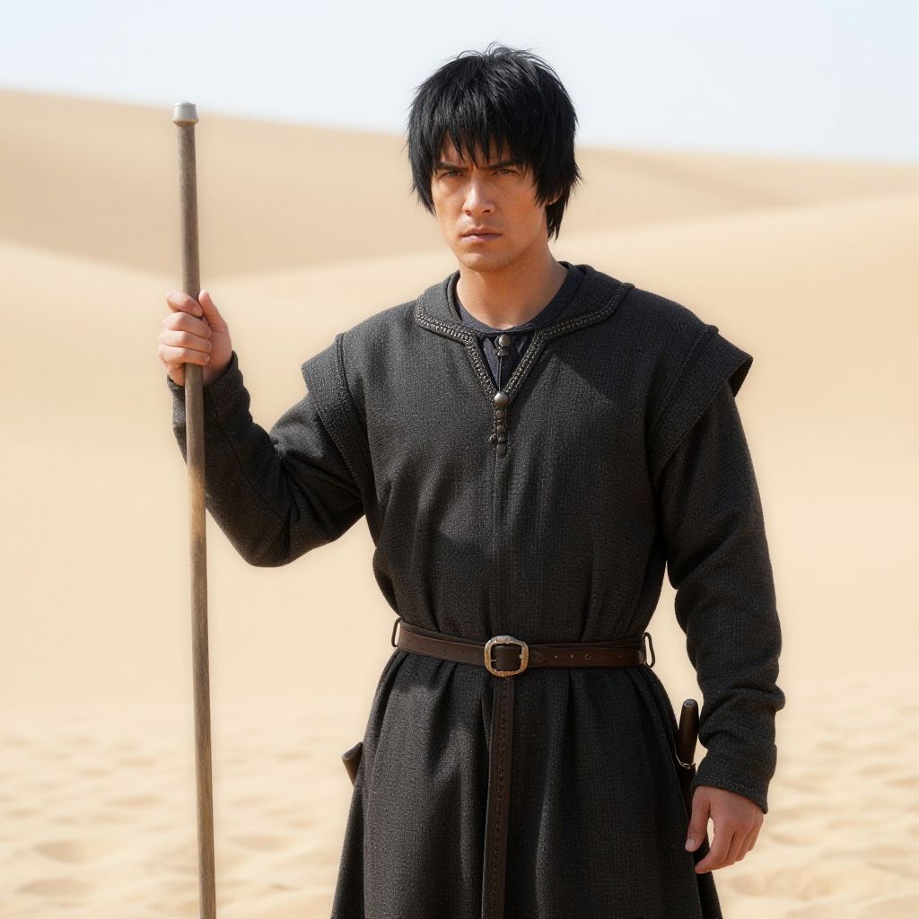 Photograph of a young Asian man with short, black, slightly messy hair, standing in a desert-like setting. He wears a dark, textured, medieval-style long tunic with a brown belt and a silver buckle. His right hand grips a tall, thin wooden staff. The background is a blurred, sandy, and sunlit expanse, emphasizing the desert environment. His expression is serious and focused. The lighting highlights the texture of his tunic and the desert's warm tones. The overall mood suggests a medieval or fantasy theme.
