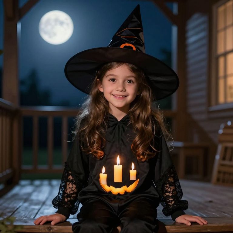 A cheerful young girl with long brown wavy hair and brown eyes, dressed in a handmade Halloween onesie with a witch's hat, black lace sleeves, and floating candles on the front, sitting on a wooden porch at night with a full moon in the background, soft warm light, realistic skin texture, detailed fabric folds