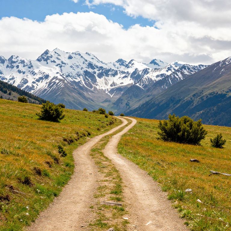Photograph of a vibrant mountain landscape with a winding, gravel path leading from the foreground to the snow-capped peaks in the background. The path is flanked by green and yellow grassy fields with scattered bushes. The sky is bright blue with fluffy white clouds. The rugged, snow-covered mountains dominate the background, creating a stunning contrast with the lush, colorful terrain in the foreground. The image captures the natural beauty and serene atmosphere of a mountainous region.