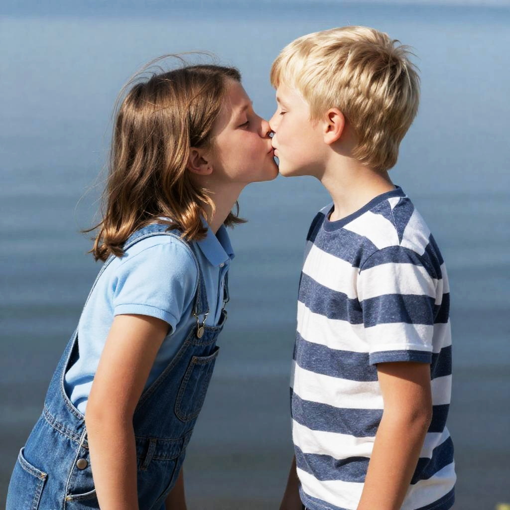 Photograph of two children. Boy with shaved head, white patterned sweater, leaning towards girl. Girl with blonde bob, dark eyeliner, purple and black blanket, smiling. Background: green patterned wallpaper. Boy's profile, girl's three-quarter view. Boy's left arm around girl's shoulder. Warm lighting.