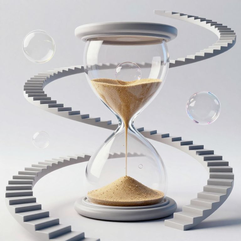 Photorealistic digital artwork of a clear glass hourglass with golden sand, positioned centrally. The hourglass is surrounded by a silver, spiral staircase-like ribbon that curls around it. Two transparent bubbles float to the left and right of the hourglass. The background is a gradient of white to light blue, creating a modern, minimalist aesthetic. The hourglass is on a white base, and the sand is mid-flow, emphasizing the concept of time passing. The image is highly detailed with sharp contrasts and a clean, polished look.