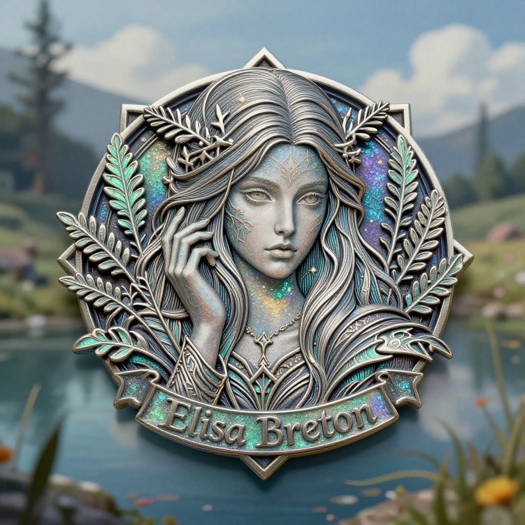 This is a digitally rendered, detailed silver brooch featuring a stylized portrait of a serene, ethereal woman with long, flowing hair and delicate features. Her hair is adorned with intricate leaf patterns, and her eyes are slightly closed, giving her a calm, mystical appearance. The background is a blurred, colorful nature scene with a lake, mountains, and greenery, enhancing the brooch's magical feel. Her face is adorned with subtle, shimmering colors, and she wears a necklace. The brooch is encircled by a laurel wreath and has a ribbon at the bottom with the name "Elise Breezor" in glittery letters.