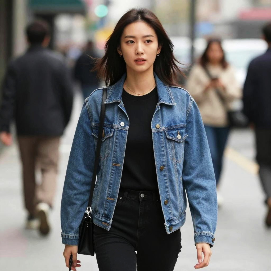 Every Mcu, woman in a black top and denim jacket standing on a street