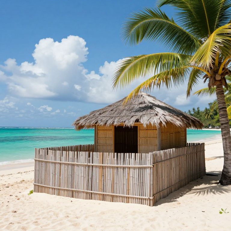 Tropical beach palisade made from bamboo, surrounding a cozy beachfront hut, palm trees swaying, crystal clear turquoise water, sunny day with fluffy white clouds, vibrant and inviting scene, realistic textures and lighting
