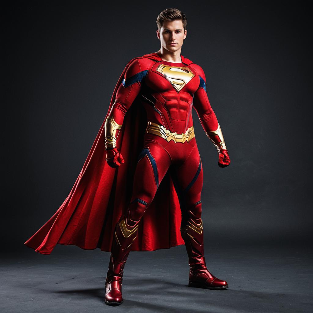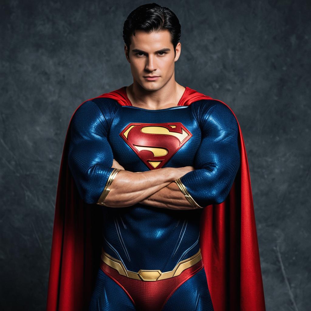 Portrait of a muscular man with black short hair wearing a shiny blue superhero bodysuit featuring a red and gold Superman emblem on the chest. The man is posing with his upper body visible against a dark background, showcasing defined pectorals and muscular arms. The expression is serious with a closed mouth, looking sideways to the left.